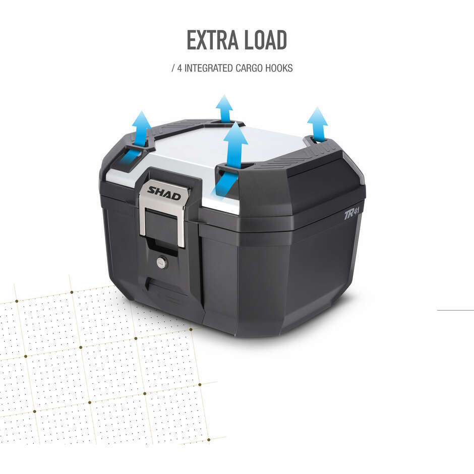 Il TR41 è un bauletto della famiglia Terra progettato per l’avventura. I materiali resistenti e il design rinforzato della base, con i telai superiori e la struttura centrale del corpo, lo rendono il bauletto più resistente e robusto della sua categoria. Include una chiusura in acciaio inossidabile con maniglia integrata e un coperchio in alluminio. Può contenere due caschi JET e può trasportare un carico massimo di 5 kg. Disponibile anche nella versione senza coperchio in alluminio.